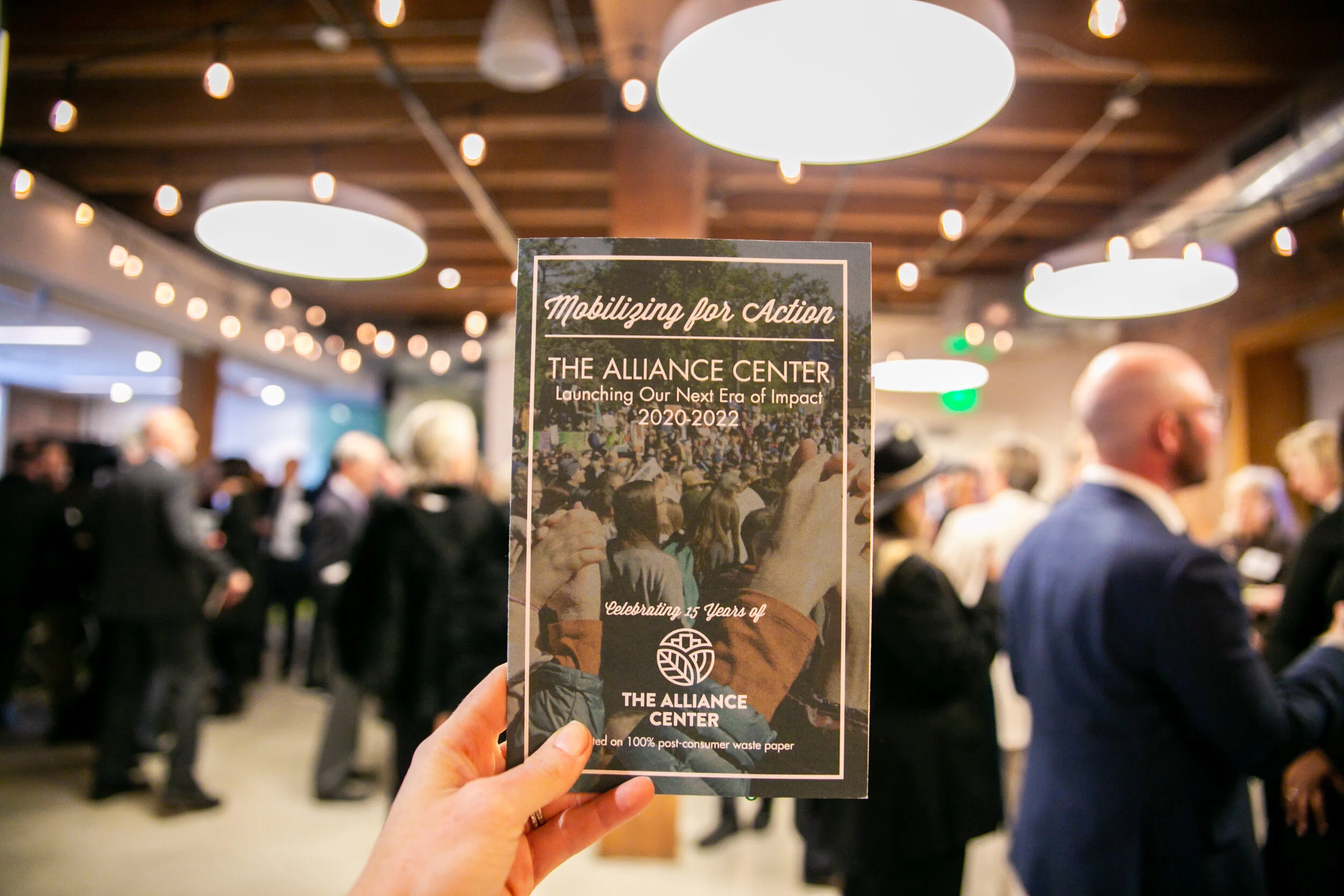 The Alliance Center fundraiser program I created with the event taking place in the background | Photo by Rebecca Todd, November 2019