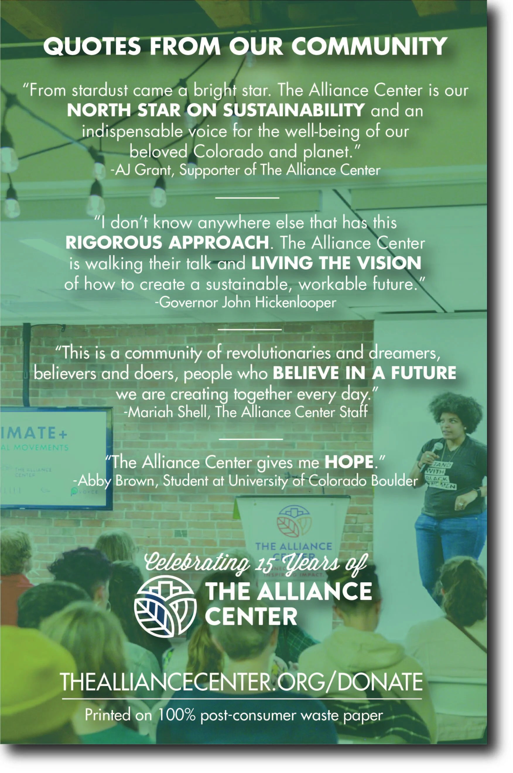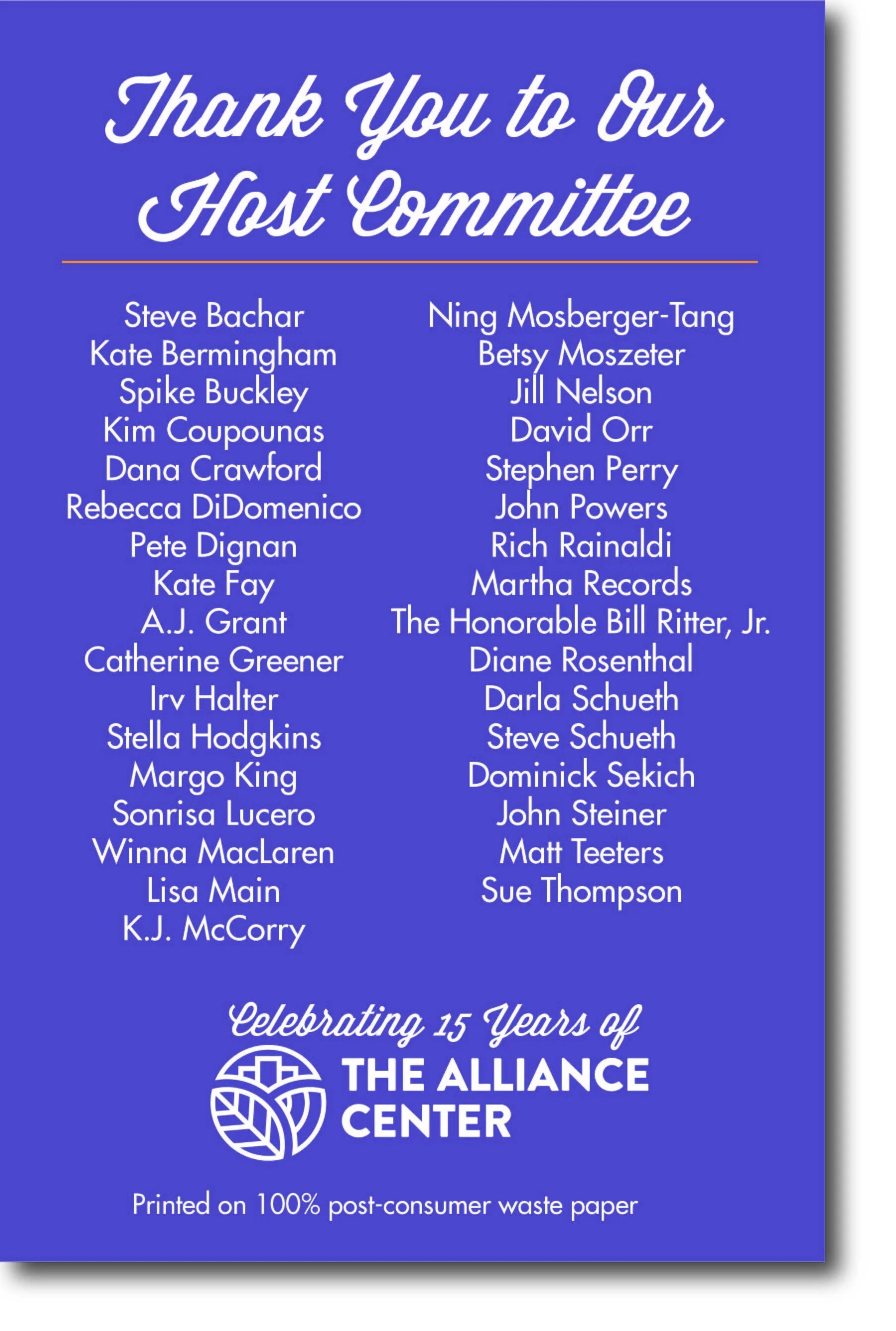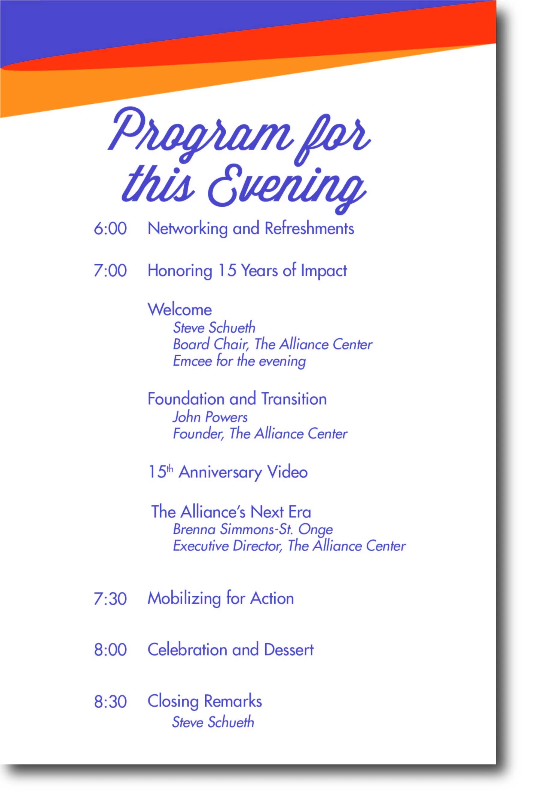 To commemorate The Alliance Center’s 15th anniversary, I played a key role in planning, promoting, and supporting a community celebration and fundraiser. I designed a cohesive suite of print and digital materials—including event invitations, programs, slide decks, and more—to build excitement and raise awareness. The event was a success, generating over $30,000 in donations.