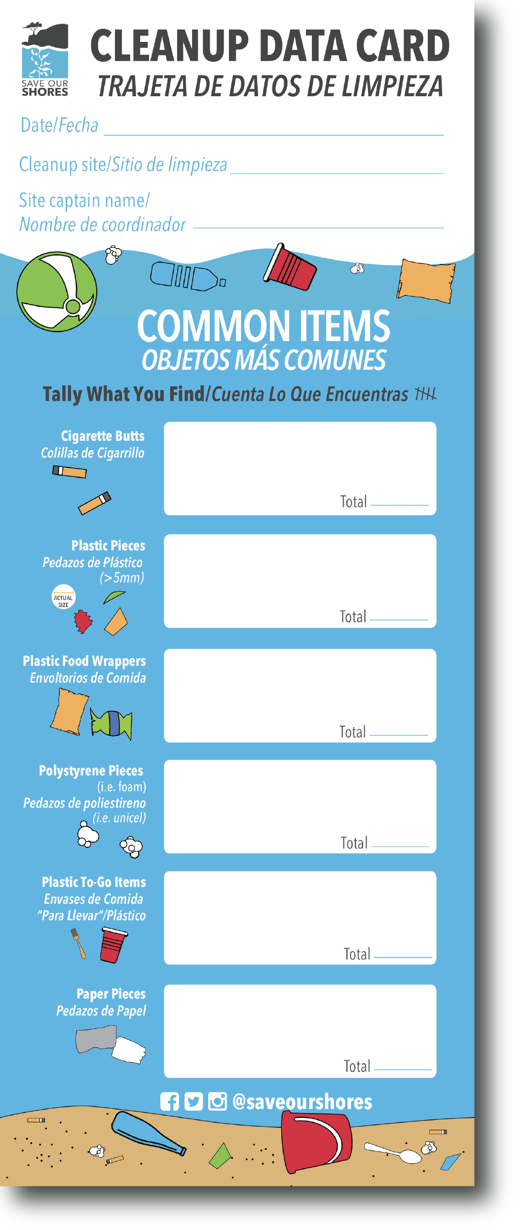 Save Our Shores organizes hundreds of beach cleanups each year across Central California, collecting valuable data on coastal debris. To improve the volunteer experience and data accuracy, I redesigned the organization’s general data cards—making them bilingual and more user-friendly for adult participants. I also developed a simplified, bilingual version specifically for children, helping make environmental education during school programs more accessible and engaging in the field.