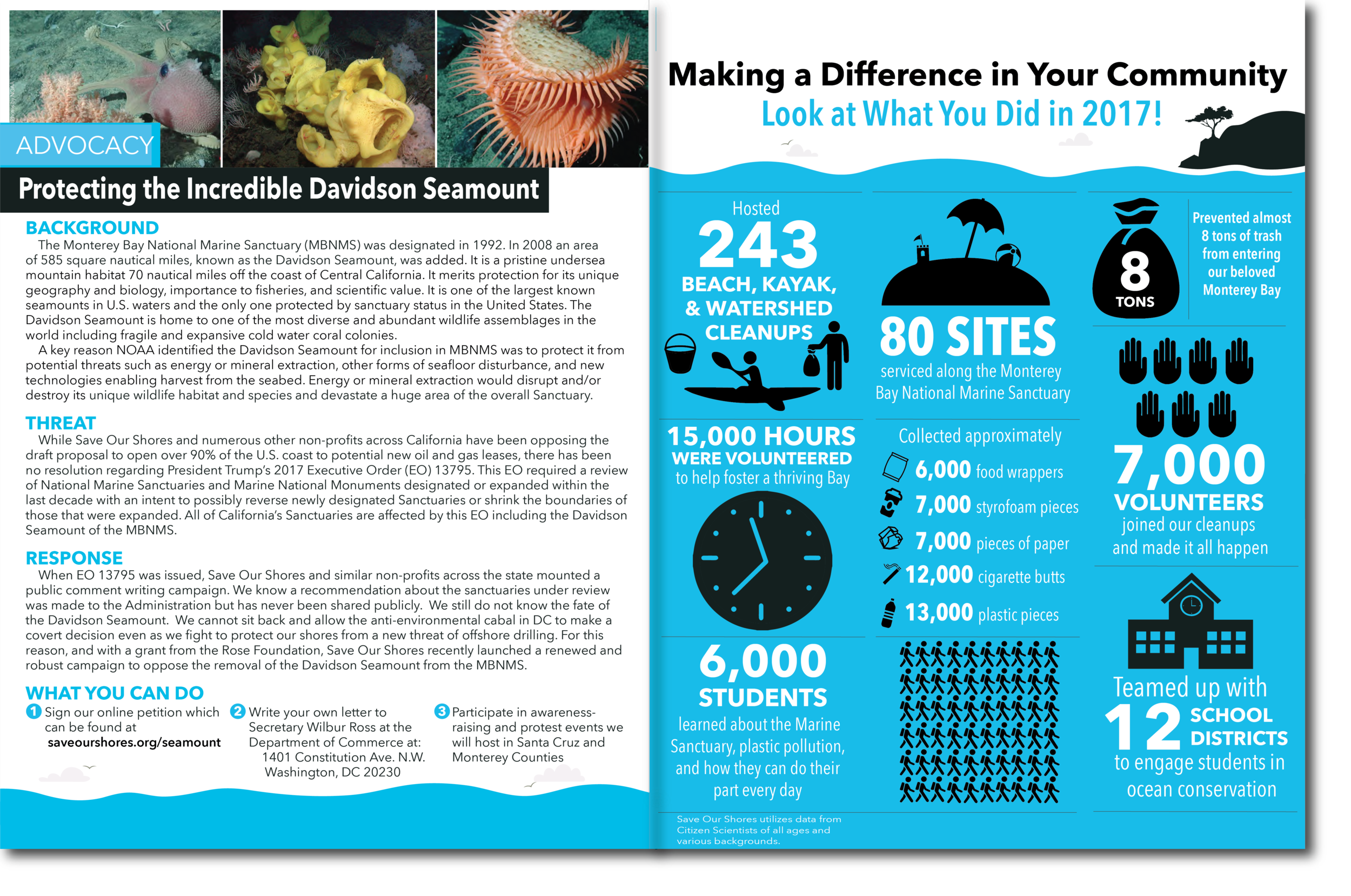 To keep over 40,000 supporters informed and engaged, I designed Save Our Shores’ quarterly newsletters—delivering timely updates on programs, events, and advocacy efforts. I also coordinated with local vendors to ensure high-quality printing and distribution, helping connect thousands of community members across Central California with the organization’s mission and impact.